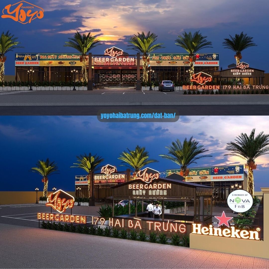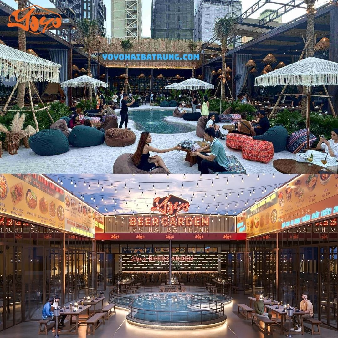 - Không gian sân vườn “có một không hai”: Bước chân vào Yoyo, bạn sẽ ngay lập tức bị ấn tượng bởi không gian sân vườn rộng lớn, thoáng đãng. Sự kết hợp tinh tế giữa màu xanh tươi mát của cây cối và ánh đèn vàng ấm áp tạo nên một khung cảnh vừa lãng mạn, vừa “chill”, giúp bạn tạm quên đi những ồn ào, náo nhiệt của phố thị.